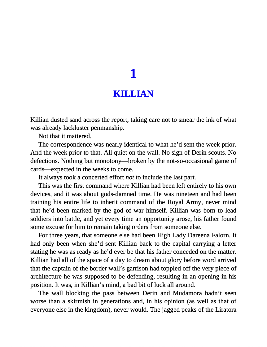 Killian is Marked by the God of War, but his gifts fail him when the realm under the dominion of the Corrupter invades Mudamora. Disgraced, he swears his sword to the kingdom’s only hope: the crown princess. But the choice sees him caught up in a web of political intrigue that will put his oath – and his heart – to the test.