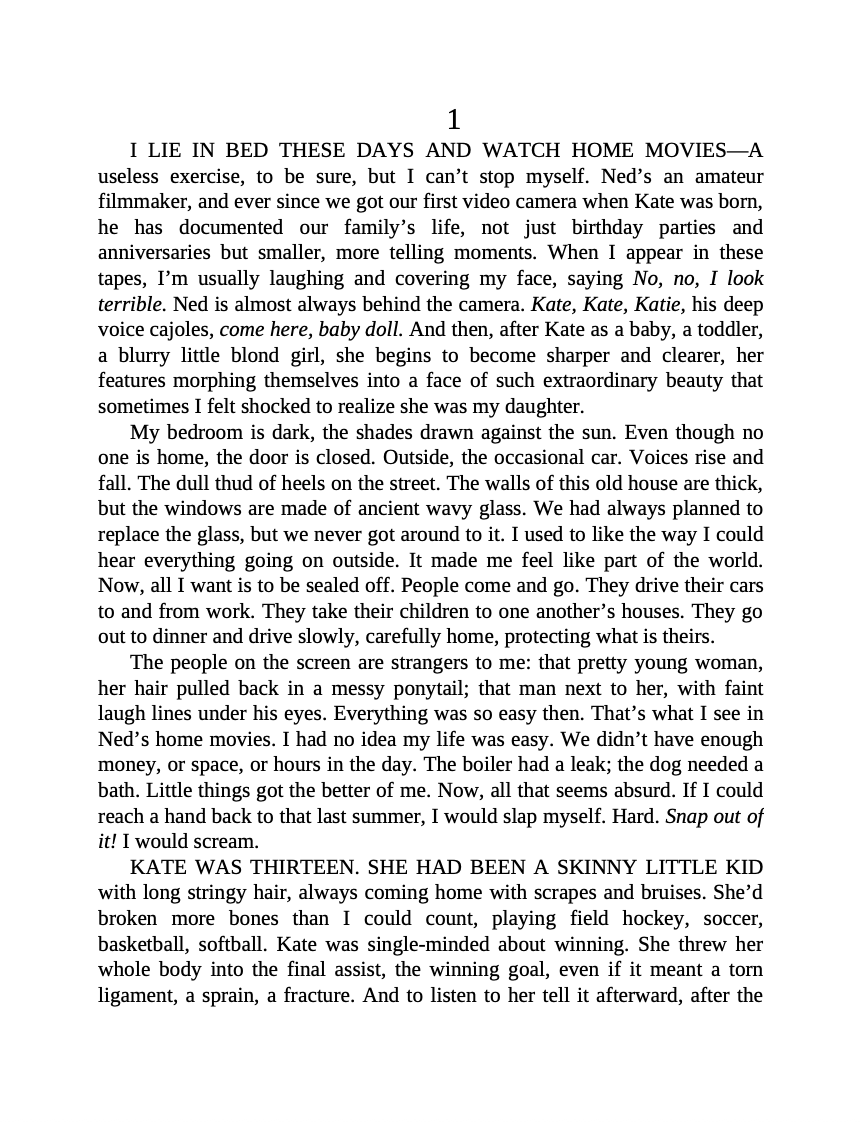 Rachel Jensen is perfectly happy: in love with her husband, devoted to their daughter Kate, gratified by her work restoring art. And finally, she’s pregnant again. But as Rachel discovers, perfection can unravel in an instant. The summer she is thirteen, Kate returns from camp sullen, angry, and withdrawn. Everyone assures Rachel it’s typical adolescent angst. But then Kate has a terrifying accident with her infant brother, and the ensuing guilt brings forth a dreadful lie—one that ruptures their family, perhaps irrevocably.