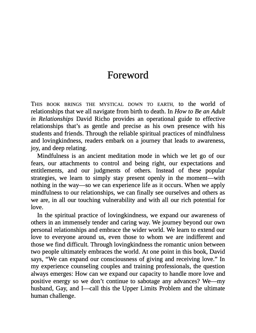 When deeply understood and applied, these five simple concepts—what Richo calls the five A's—form the basis of mature love. They help us to move away from judgment, fear, and blame to a position of openness, compassion, and realism about life and relationships. By giving and receiving these five A's, relationships become deeper and more meaningful, and they become a ground for personal transformation.