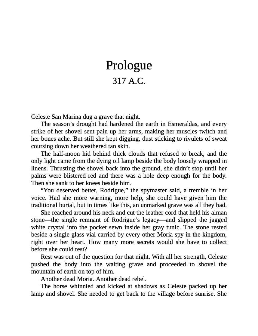 When Dez, the commander of her unit-and the boy she's grown to love-is taken captive by the notorious Principe Dorado, Renata must return to Andalucia and complete Dez's top secret mission herself. Can she keep her cover, even as she burns for vengeance against the brutal, enigmatic prince? Her life and the fate of the Moria depend on it.