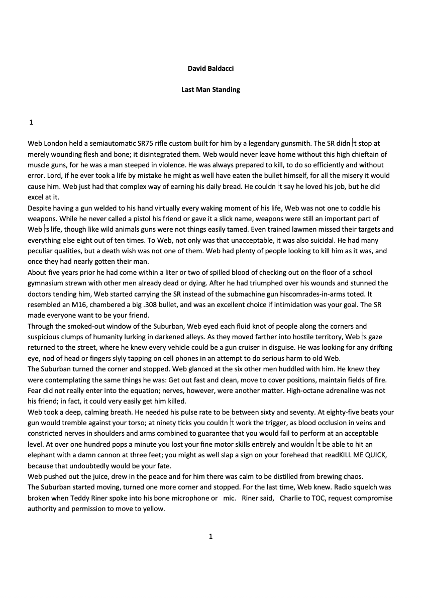 Now Web is trying to put his life back together and understand what really happened. To get answers, he'll need the help of psychiatrist Claire Daniels and the one other human being who lived through the attack--a ten-year-old boy. But when his search leads him back to that bloodstained alley, Web suddenly realizes he is about to face his assassin again. And this time, one of them will become the Last Man Standing.