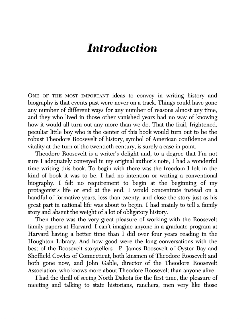 Mornings on Horseback is about the world of the young Theodore Roosevelt. It is the story of a remarkable little boy, seriously handicapped by recurrent and nearly fatal attacks of asthma, and his struggle to manhood: an amazing metamorphosis seen in the context of the very uncommon household (and rarefied social world) in which he was raised.