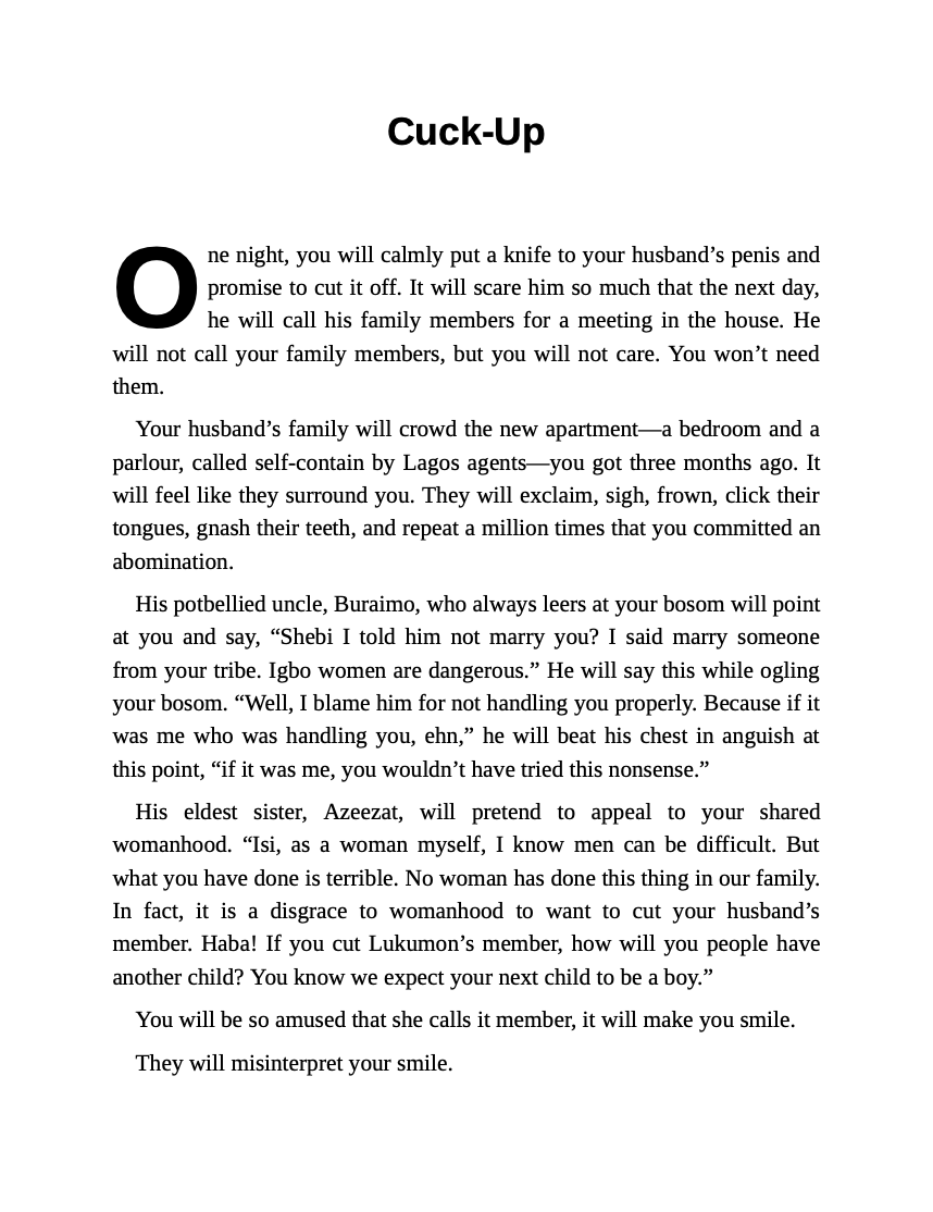 There's a story of a young lady who tries to find her oyibo soulmate on the streets of Lagos; another of a pastor's wife who defends her husband from an allegation of adultery; a wife takes a knife to her husband's penis; a night of lust between a rising musician and his Instagram baddie takes an unexpected turn.