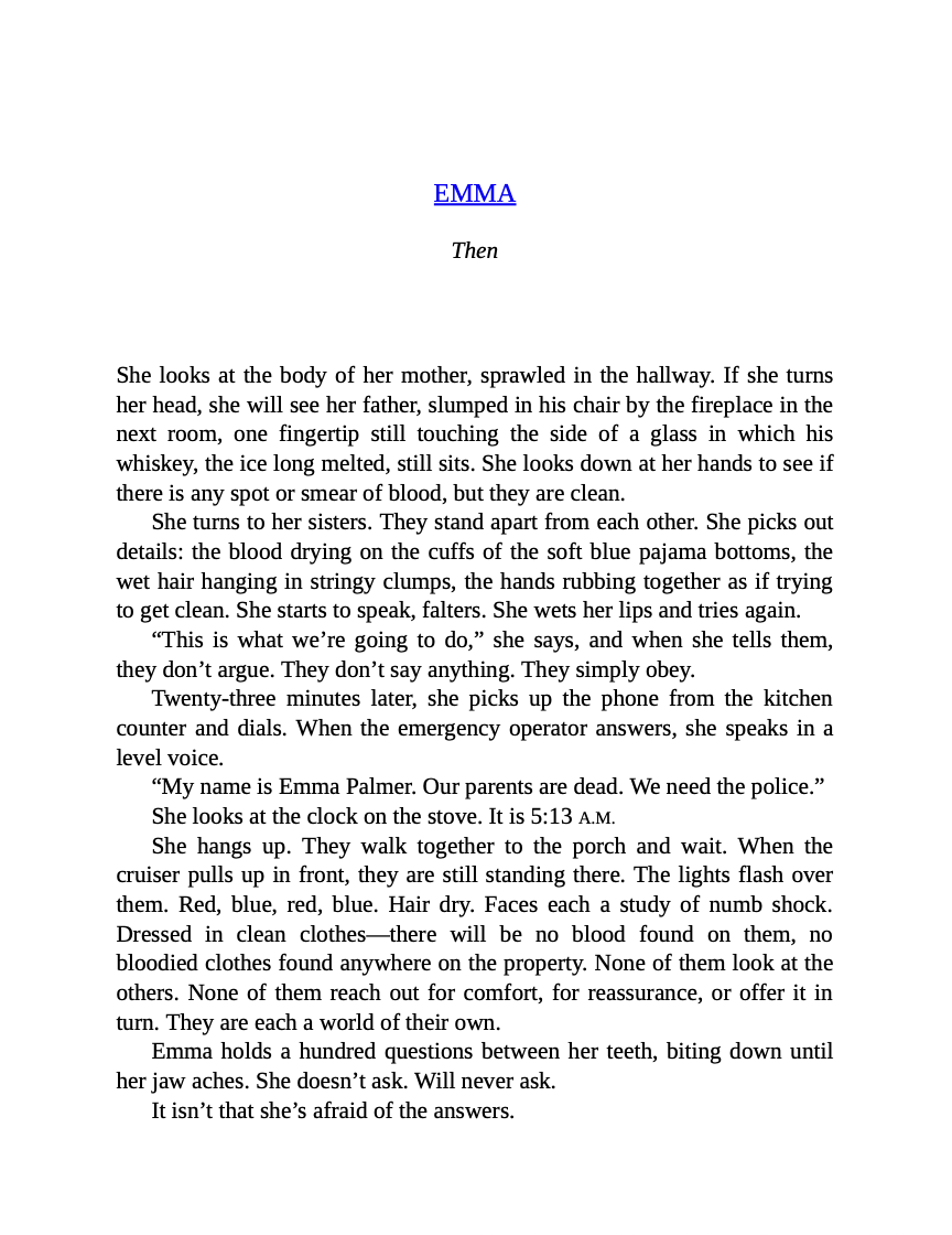 Emma has never told anyone what she saw the night her parents died, even when she became the prime suspect. But her presence in the house threatens to uncover secrets that have stayed hidden for years, and the sisters are drawn together once again. As they face their memories of the past, rivalries restart, connections are forged, and, for the first time, Emma starts to ask questions about what really happened that night.