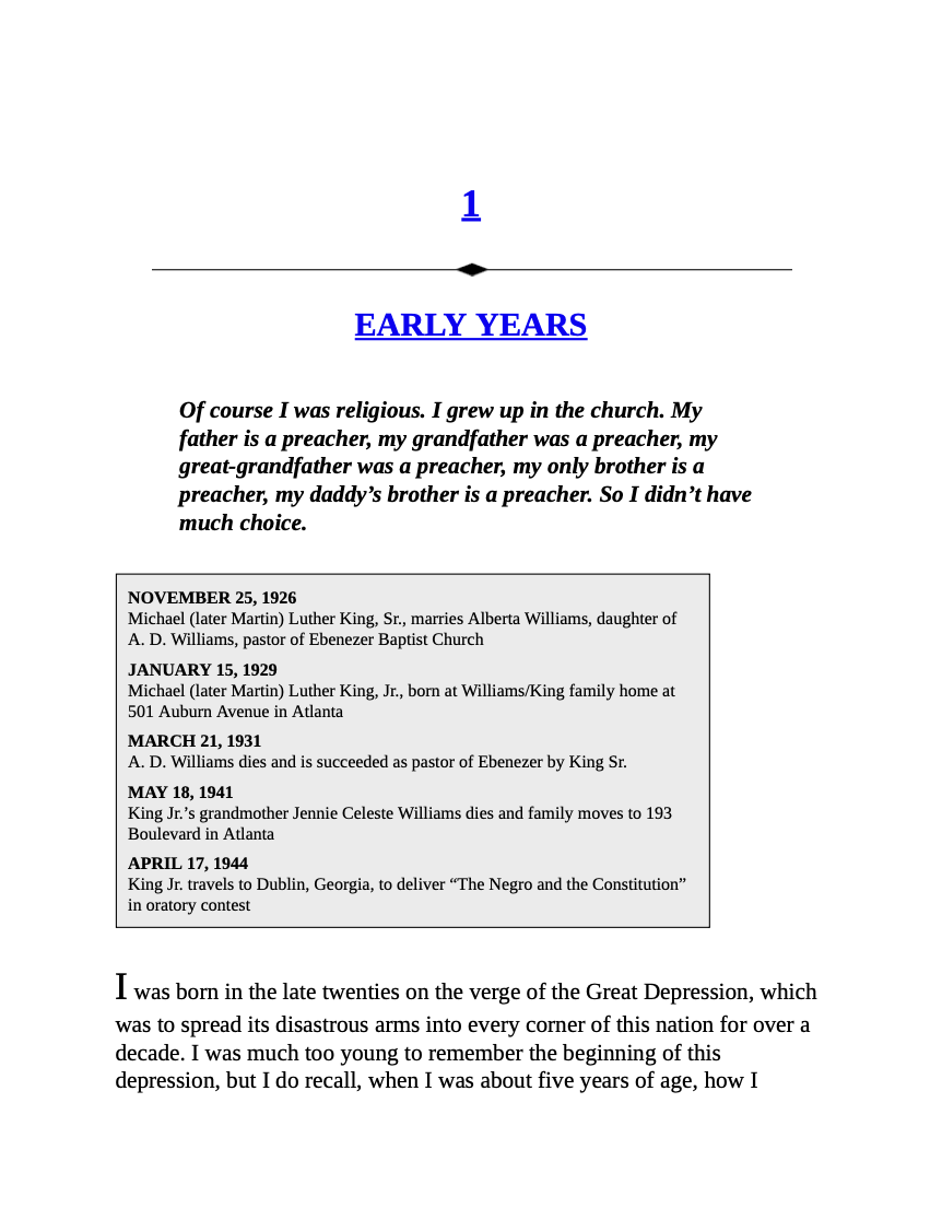 Written in his own words, this history-making autobiography is Martin Luther King: the mild-mannered, inquisitive child and student who chafed under and eventually rebelled against segregation; the dedicated young minister who continually questioned the depths of his faith and the limits of his wisdom; the loving husband and father who sought to balance his family's needs with those of a growing, nationwide movement; and the reflective, world-famous leader who was fired by a vision of equality for people everywhere.