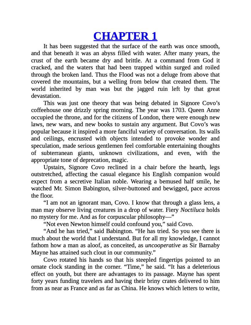 London, 1703. In a time when the old approaches to science coexist with the new, one elite community attempts to understand the world by collecting its wonders. Sir Barnaby Mayne, the most formidable of these collectors, has devoted his life to filling his cabinets. While the curious-minded vie for invitations to study the rare stones, bones, books, and artifacts he has amassed, some visitors come with a darker purpose.