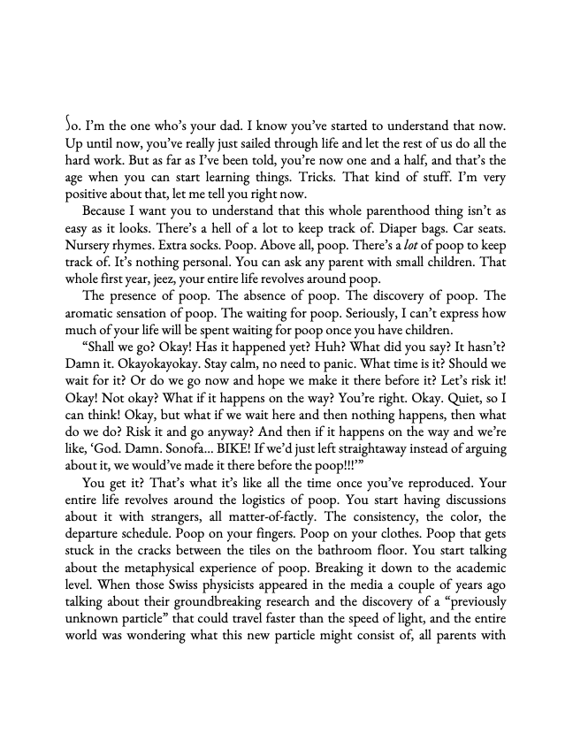 As he conveys his profound awe at experiencing all the “firsts” that fill him with wonder and catch him completely unprepared, Fredrik Backman doesn’t shy away from revealing his own false steps and fatherly flaws, tackling issues both great and small, from masculinity and mid-life crises to practical jokes and poop.