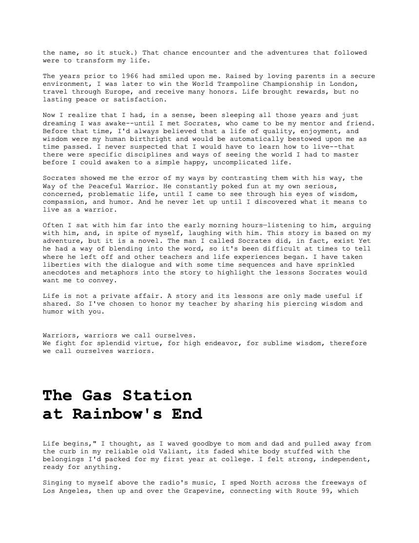 A book that could change your life: When Dan Millman was a young man, he expected that hard work would eventually bring a life of comfort, wisdom, and happiness. Yet, despite his many successes, he was haunted by the feeling that something was missing. Awakened by dark dreams one night, Dan found himself at a gas station with an old man named Socrates, and his world was changed forever. Guided by this eccentric old warrior, and inspired by a young woman named Joy, Dan began a spiritual odyssey into realms of light and shadow, romance and mystery, toward a final confrontation that would deliver or destroy him.