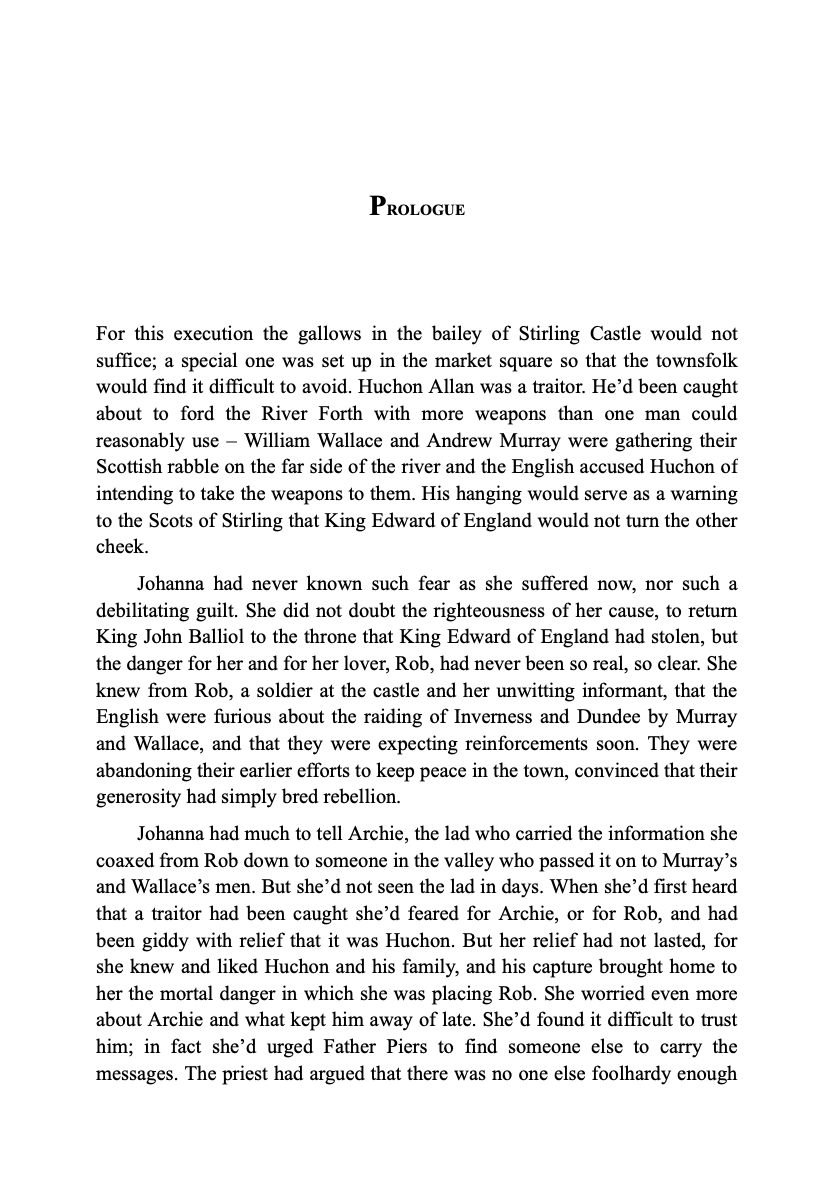 Passionate, brave and fiercely loyal, Margaret Kerr - a young woman estranged from her husband - is determined to play her part in saving Scotland from the hammer of Edward Longshanks - King of England and would-be King of the Scots. And so she travels to Stirling to discover why the informer upon whom the Scottish rebels depend has become unreliable.