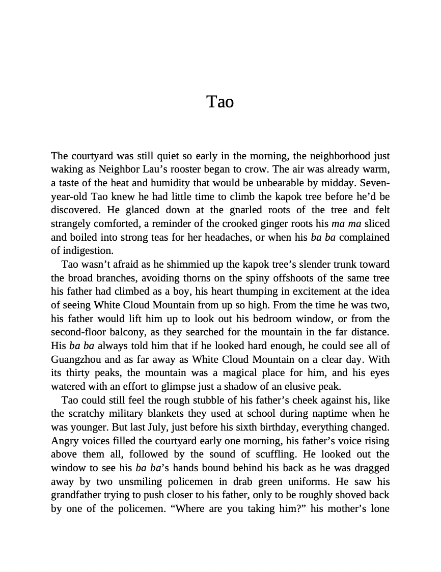 China, 1957. Chairman Mao has declared a new openness in society: "Let a hundred flowers bloom; let a hundred schools of thought contend." Many intellectuals fear it is only a trick, and Kai Ying's husband, Sheng, a teacher, has promised not to jeopardize their safety or that of their young son, Tao. But one July morning, just before his sixth birthday, Tao watches helplessly as Sheng is dragged away for writing a letter criticizing the Communist Party and sent to a labor camp for "reeducation."