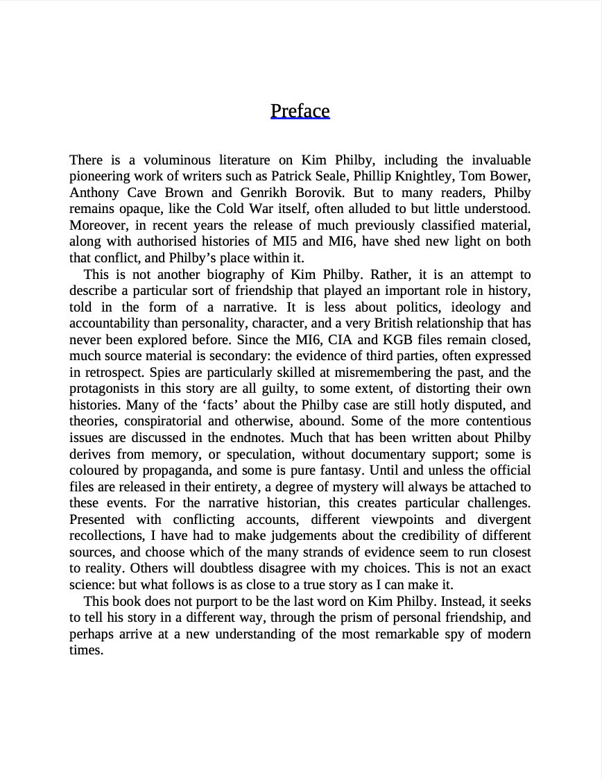 In the aftermath of the Second World War, Kim Philby, Nicholas Elliot and James Jesus Angleton were rising stars in the intelligence world, and firm friends. The three spies belonged to the same clubs, drank in the same bars, wore the same well-tailored suits and spoke in similar cut-glass accnts. Philby and Eliott were in the 'golden lads' of MI6, Britain's secret intelligence service; Angleton was the brilliant young American chief of counter-intelligence at the CIA. For years, they shared every secret. But Philby had one secret he did not disclose : he was, all along, covertly working for Moscow, divulding everything to his Soviet spymasters, with bloody consequences. Elliott and Angleton thought they knew Philby better than anyone, and then discovered they had known him not at all. This is a story of trust and treachery, class and consciences; of an ideological battle between friends, exquisitely polite and perfectly ruthless, waged in the comfortable clubs and restaurants of London and Washinton; of male friendships forged, and then systematically betrayed.