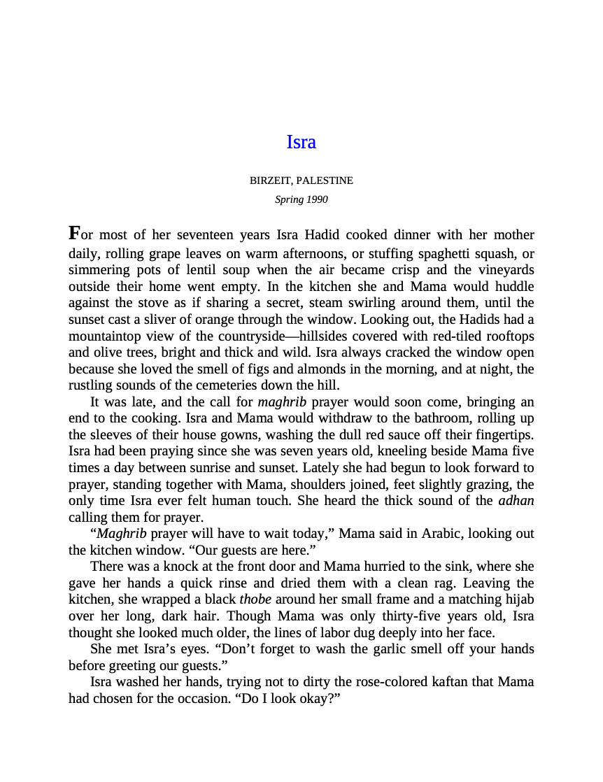 Brooklyn, 2008. Eighteen-year-old Deya, Isra’s oldest daughter, must meet with potential husbands at her grandmother Fareeda’s insistence, though her only desire is to go to college. Deya can’t help but wonder if her options would have been different had her parents survived the car crash that killed them when Deya was only eight. But her grandmother is firm on the matter: the only way to secure a worthy future for Deya is through marriage to the right man.