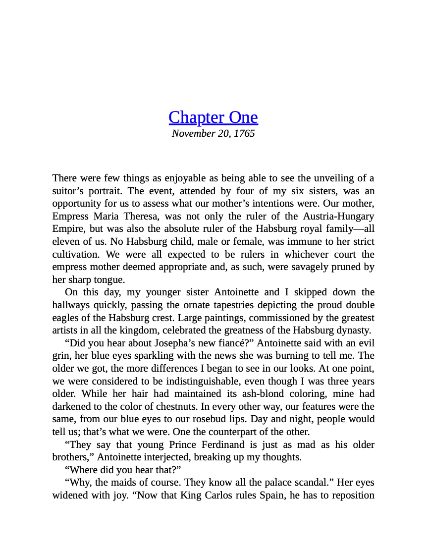 Austria 1767: Maria Carolina Charlotte--tenth daughter and one of sixteen children of Empress Maria Theresa of Austria--knows her position as a Habsburg archduchess will inevitably force her to leave her home, her family, and her cherished sister, Antoinette, whose companionship she values over all else. But not yet. The Habsburg family is celebrating a great triumph: Charlotte's older sister, Josepha, has been promised to King Ferdinand IV of Naples and will soon take her place as queen. Before she can journey to her new home, however, tragedy strikes. After visiting the family crypt, Josepha contracts smallpox and dies. Shocked, Charlotte is forced to face an unthinkable new reality: she must now marry Ferdinand in her sister's stead.