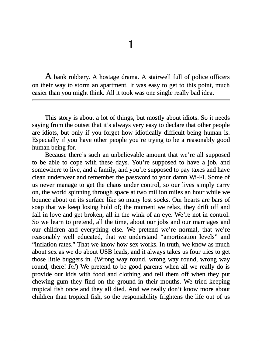 Looking at real estate isn’t usually a life-or-death situation, but an apartment open house becomes just that when a failed bank robber bursts in and takes a group of strangers hostage. The captives include a recently retired couple who relentlessly hunt down fixer-uppers to avoid the painful truth that they can’t fix their own marriage. There’s a wealthy bank director who has been too busy to care about anyone else and a young couple who are about to have their first child but can’t seem to agree on anything, from where they want to live to how they met in the first place. Add to the mix an eighty-seven-year-old woman who has lived long enough not to be afraid of someone waving a gun in her face, a flustered but still-ready-to-make-a-deal real estate agent, and a mystery man who has locked himself in the apartment’s only bathroom, and you’ve got the worst group of hostages in the world.