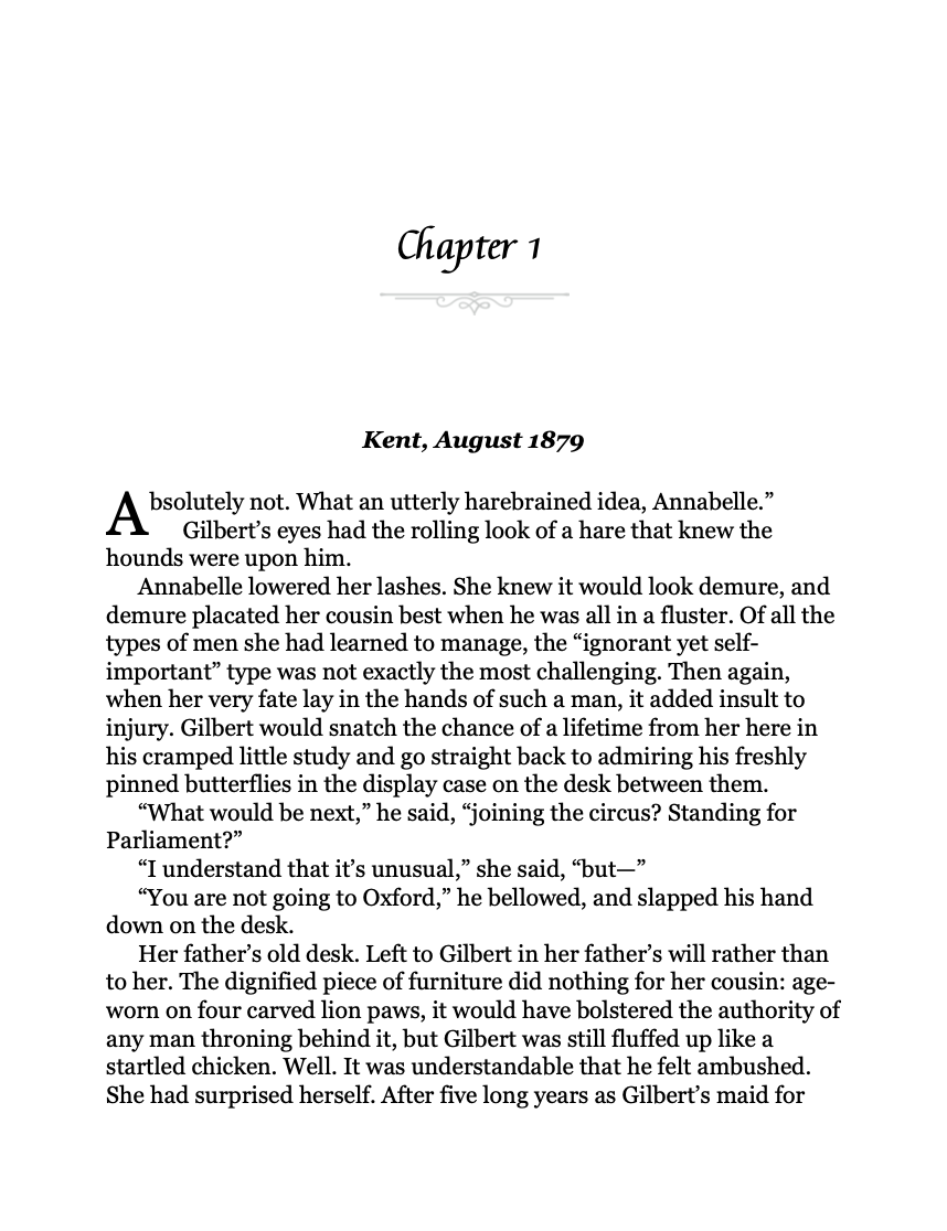 England, 1879. Annabelle Archer, the brilliant but destitute daughter of a country vicar, has earned herself a place among the first cohort of female students at the renowned University of Oxford. In return for her scholarship, she must support the rising women's suffrage movement. Her charge: recruit men of influence to champion their cause. Her target: Sebastian Devereux, the cold and calculating Duke of Montgomery who steers Britain's politics at the Queen's command. Her challenge: not to give in to the powerful attraction she can't deny for the man who opposes everything she stands for.