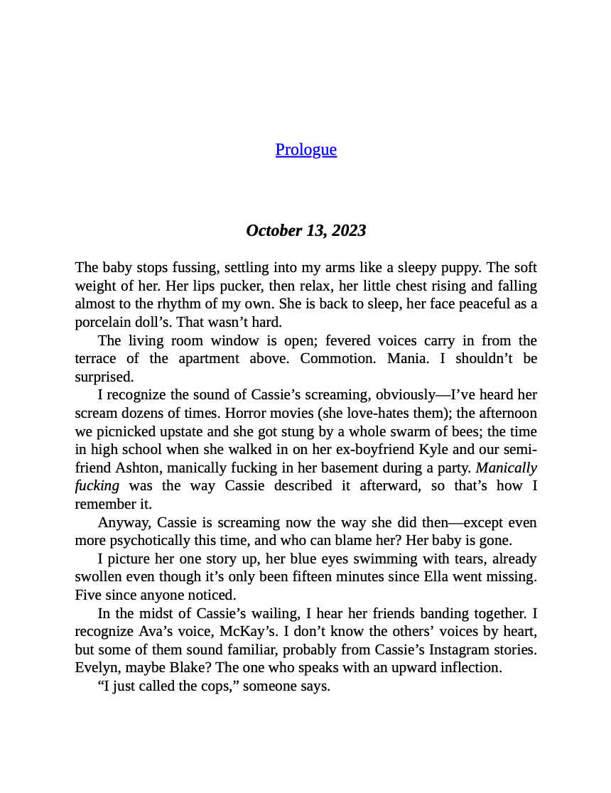 On a brisk fall night in a New York apartment, 35-year-old Billie West hears terrified screams. It's her lifelong best friend Cassie Barnwell, one floor above, and she's just realized her infant daughter has gone missing. Billie is shaken as she looks down into her own arms to see the baby, remembering—with a jolt of fear—that she is responsible for the kidnapping that has instantly shattered Cassie’s world.