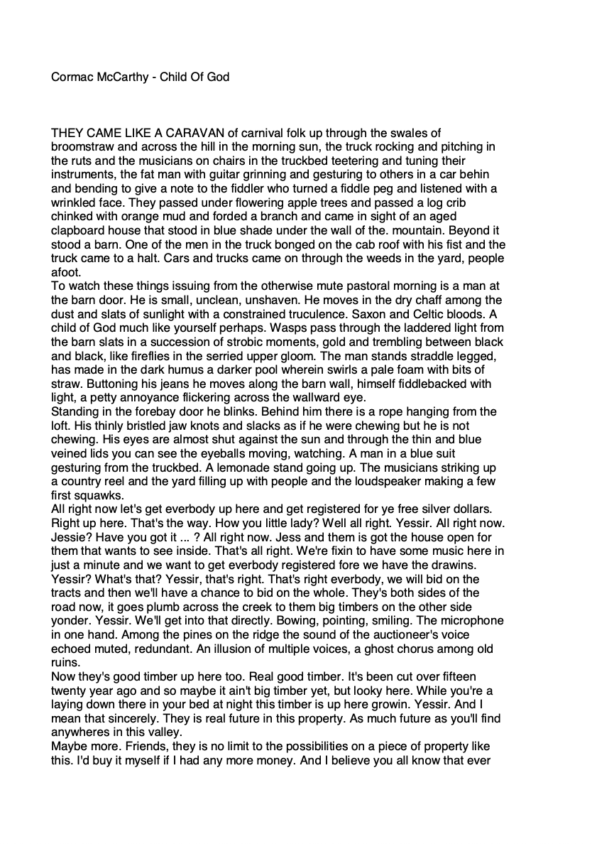 Child of God is a taut, chilling novel that plumbs the depths of human degradation. Lester Ballard, a violent, solitary and introverted young backwoodsman dispossessed on his ancestral land, is released from jail and allowed to haunt the hill country of East Tennessee, preying on the population with his strange lusts. McCarthy transforms commonplace brushes with humanity - in homesteads, stores and in the woods - into stunning scenes of the comic and the grotesque, and as the story hurtles toward its unforgettable conclusion, depicts the most sordid aspects of life with dignity, humour, and characteristic lyrical brilliance.