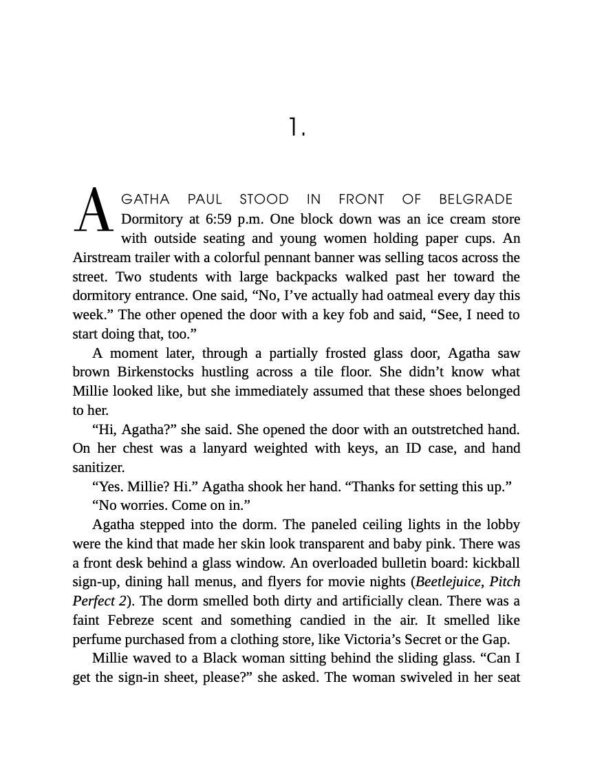 It's 2017 at the University of Arkansas, and Millie Cousins—a super-senior resident assistant at Belgrade Dormitory—just wants to graduate, get a job, and buy a house. So when Agatha Paul, a writer and visiting professor itching for her next big topic, offers Millie an easy yet unusual opportunity for them to help each other further their own interests, Millie naturally jumps at the chance.