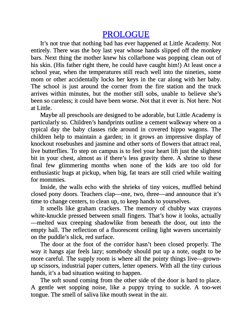 Darby, Mary Beth, and Rhea are on personal quests to reclaim aspects of their identities subsumed by motherhood—their careers, their sex lives, their bodies. But their children disrupt their plans when an unsettling medical condition begins to go around the Little Academy preschool: the kids are craving blood.