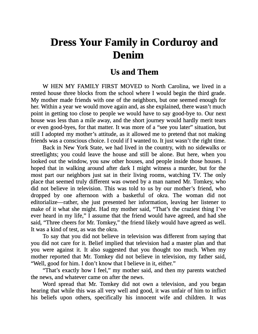 David Sedaris plays in the snow with his sisters. He goes on vacation with his family. He gets a job selling drinks. He attends his brother's wedding. He mops his sister's floor. He gives directions to a lost traveler. He eats a hamburger. He has his blood sugar tested. It all sounds so normal, doesn't it? In his newest collection of essays, David Sedaris lifts the corner of ordinary life, revealing the absurdity teeming below its surface. His world is alive with obscure desires and hidden motives -- a world where forgiveness is automatic and an argument can be the highest form of love. Dress Your Family in Corduroy and Denim is another unforgettable collection from one of the wittiest and most original writers at work today.
