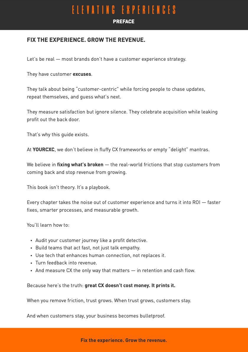 Elevating Experiences: A Comprehensive Guide to Customer Experience Excellence by YOURCXC is a bold, no-fluff handbook for business leaders who want customer experience that actually drives revenue.