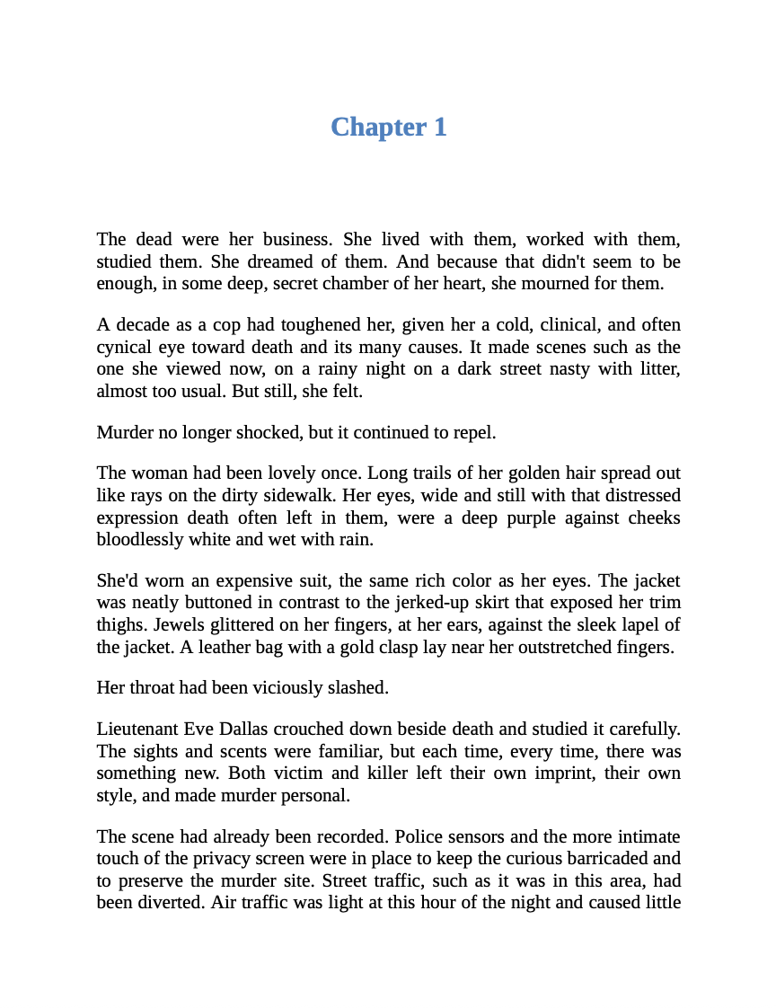 The first victim was found lying on a sidewalk in the rain. The second was murdered in her own apartment building. Police Lieutenant Eve Dallas had no problem finding connections between the two crimes. Both victims were beautiful and highly successful women. Their glamorous lives and loves were the talk of the city. And their intimate relations with men of great power and wealth provided Eve with a long list of suspects—including her own lover, Roarke. As a woman, Eve was compelled to trust the man who shared her bed. But as a cop, it was her job to follow every lead...to investigate every scandalous rumor...to explore every secret passion, no matter how dark. Or how dangerous.