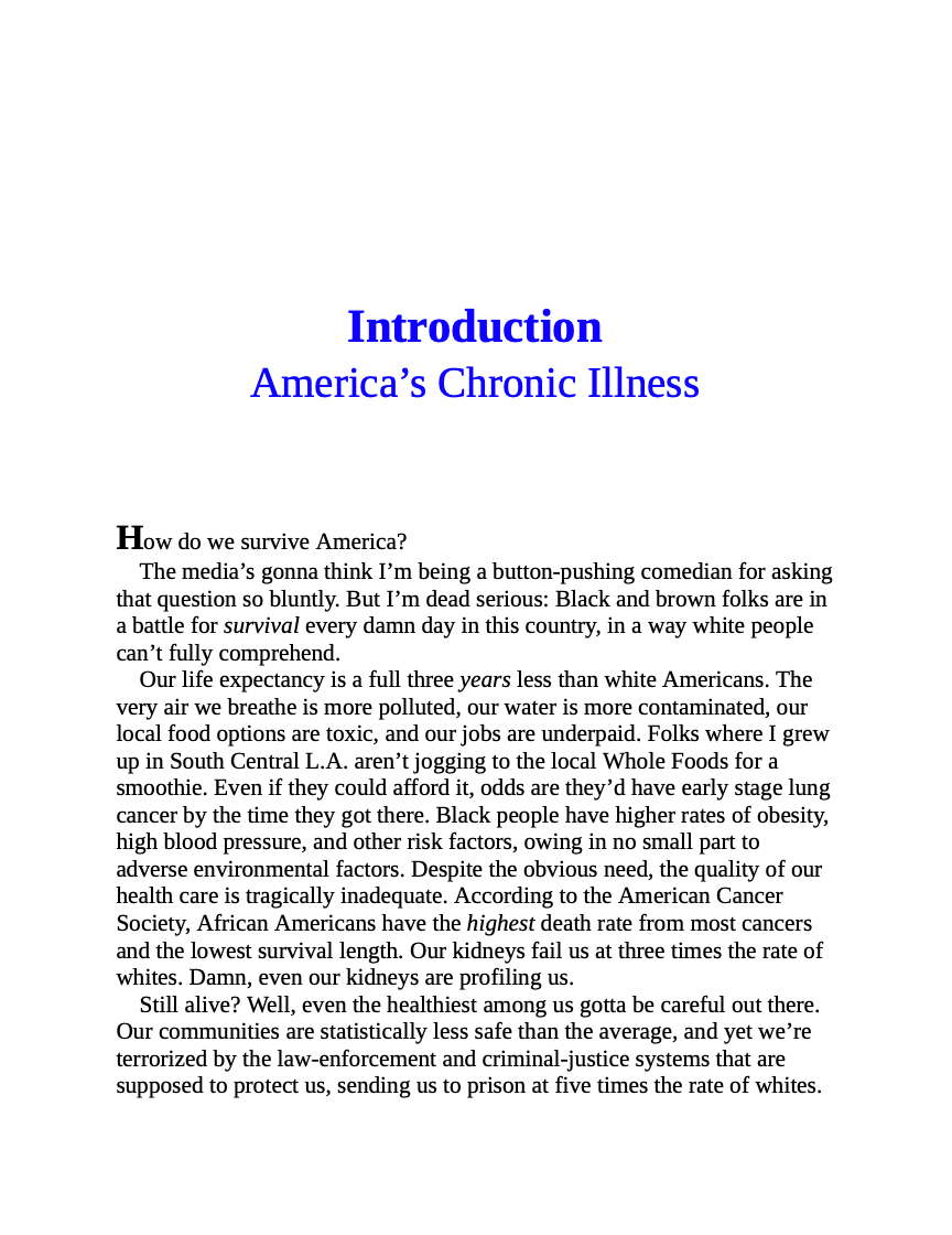 Even before COVID-19 disproportionately impacted minority communities, life expectancy for Blacks was a full three years less than for white Americans. The very air we breathe is more polluted, our water is more contaminated, our local food options are toxic, and our jobs are underpaid. Despite the obvious need, the quality of our health care is tragically inadequate. Our communities are statistically less safe than the average, and yet we're terrorized by the law-enforcement and criminal-justice systems that are supposed to protect us, sending Blacks to prison at five times the rate of whites. Not least, our means of addressing these injustices--voting--is perennially under assault.