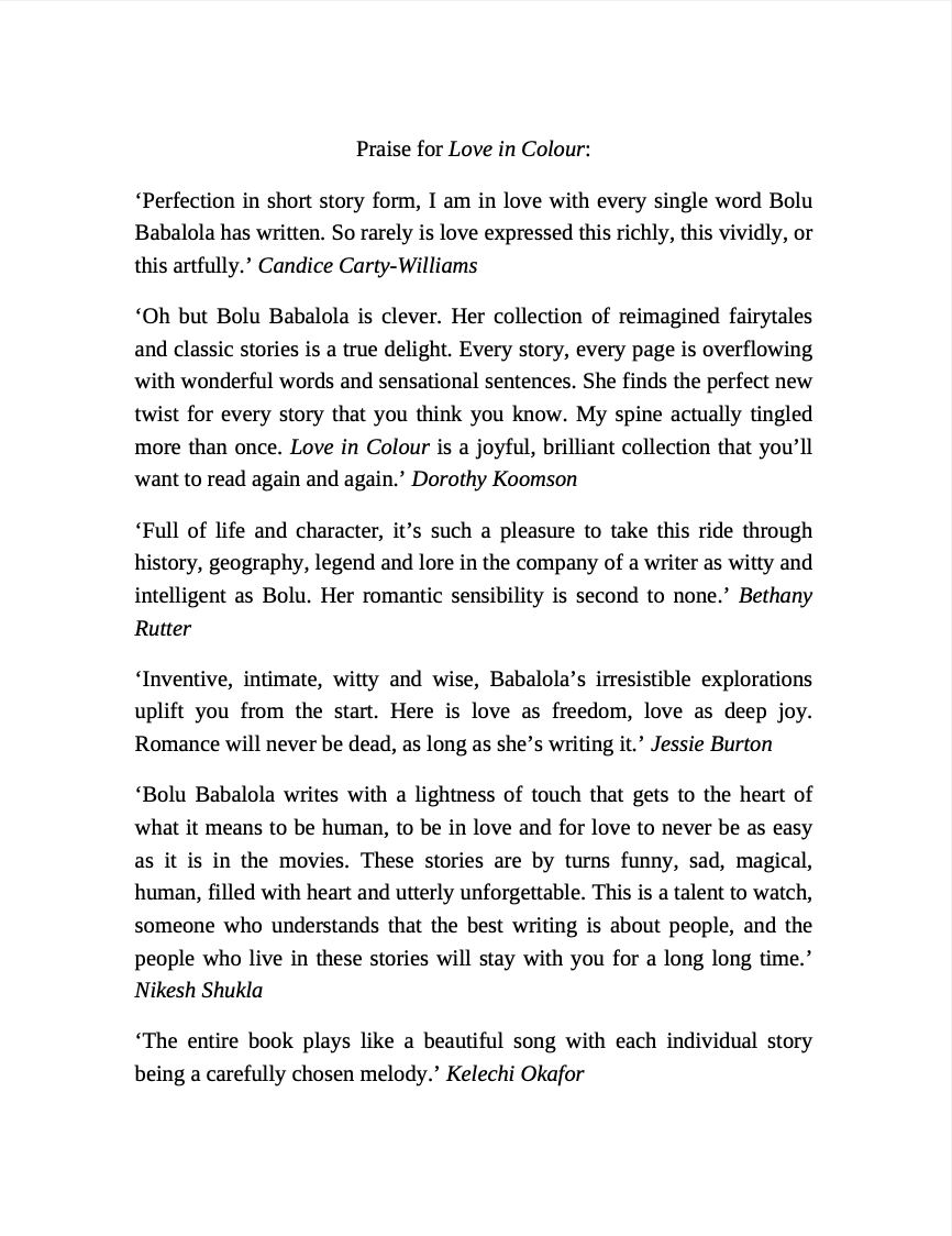 A high-born Nigerian goddess feels beaten down and unappreciated by her gregarious lover and longs to be truly seen.A young businesswoman attempts to make a great leap in her company, and an even greater one in her love life.A powerful Ghanaian spokeswoman is forced to decide whether to uphold her family's politics, or to be true to her heart.Whether captured in the passion of love at first sight, or realising that self-love takes precedent over the latter, the characters in these vibrant stories try to navigate this most complex human emotion and understand why it holds them hostage.Moving exhilaratingly across perspectives, continents and genres, from the historic to the vividly current, Love in Colour is a celebration of romance in all of its forms.'Captivating.' Vice