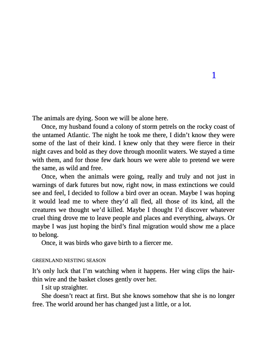Franny Stone has always been a wanderer. By following the ocean’s tides and the birds that soar above, she can forget the losses that have haunted her life. But when the wild she loves begins to disappear, Franny can no longer wander without a destination. She arrives in remote Greenland with one purpose: to find the world’s last flock of Arctic terns and track their final migration. She convinces Ennis Malone, captain of the Saghani, to take her onboard, winning over his eccentric crew with promises that the birds will lead them to fish.