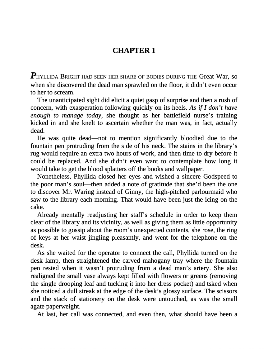 The manor is home to archaeologist Max Mallowan and his famous wife, Agatha Christie. Phyllida is both loyal to and protective of the crime writer, who is as much friend as employer. An aficionado of detective fiction, Phyllida has yet to find a gentleman in real life half as fascinating as Mrs. Agatha's Belgian hero, Hercule Poirot. But though accustomed to murder and its methods as frequent topics of conversation, Phyllida is unprepared for the sight of a very real, very dead body on the library floor...