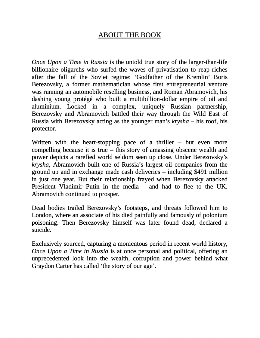Once Upon a Time in Russia is the untold true story of the larger-than-life billionaire oligarchs who surfed the waves of privatization to reap riches after the fall of the Soviet regime: "Godfather of the Kremlin" Boris Berezovsky, a former mathematician whose first entrepreneurial venture was running an automobile reselling business, and Roman Abramovich, his dashing young protege who built a multi-billion-dollar empire of oil and aluminium. Locked in a complex, uniquely Russian partnership, Berezovsky and Abramovich battled their way through the "Wild East" of Russia with Berezovsky acting as the younger man's krysha- literally, his roof, his protector.