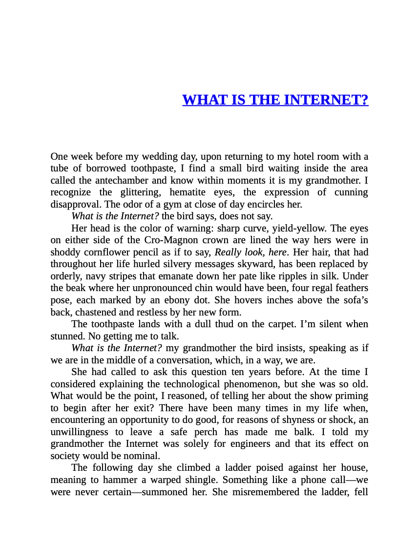 The week of her wedding, The Bride is visited by a bird she recognizes as her dead grandmother because of the cornflower blue line beneath her eyes, her dubious expression, and the way she asks: What is the Internet?