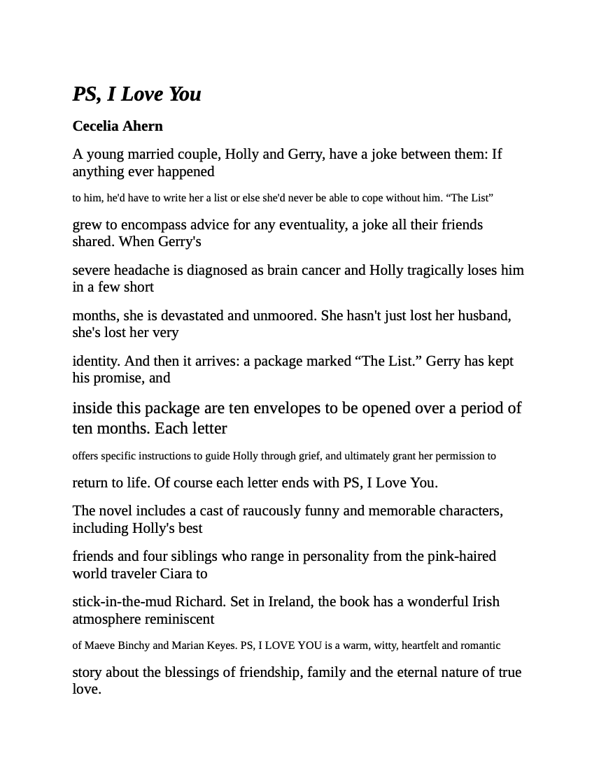 The kind of enchanting novel with cross-generational appeal that comes along once in a great while, PS, I Love You is a captivating love letter to the world!