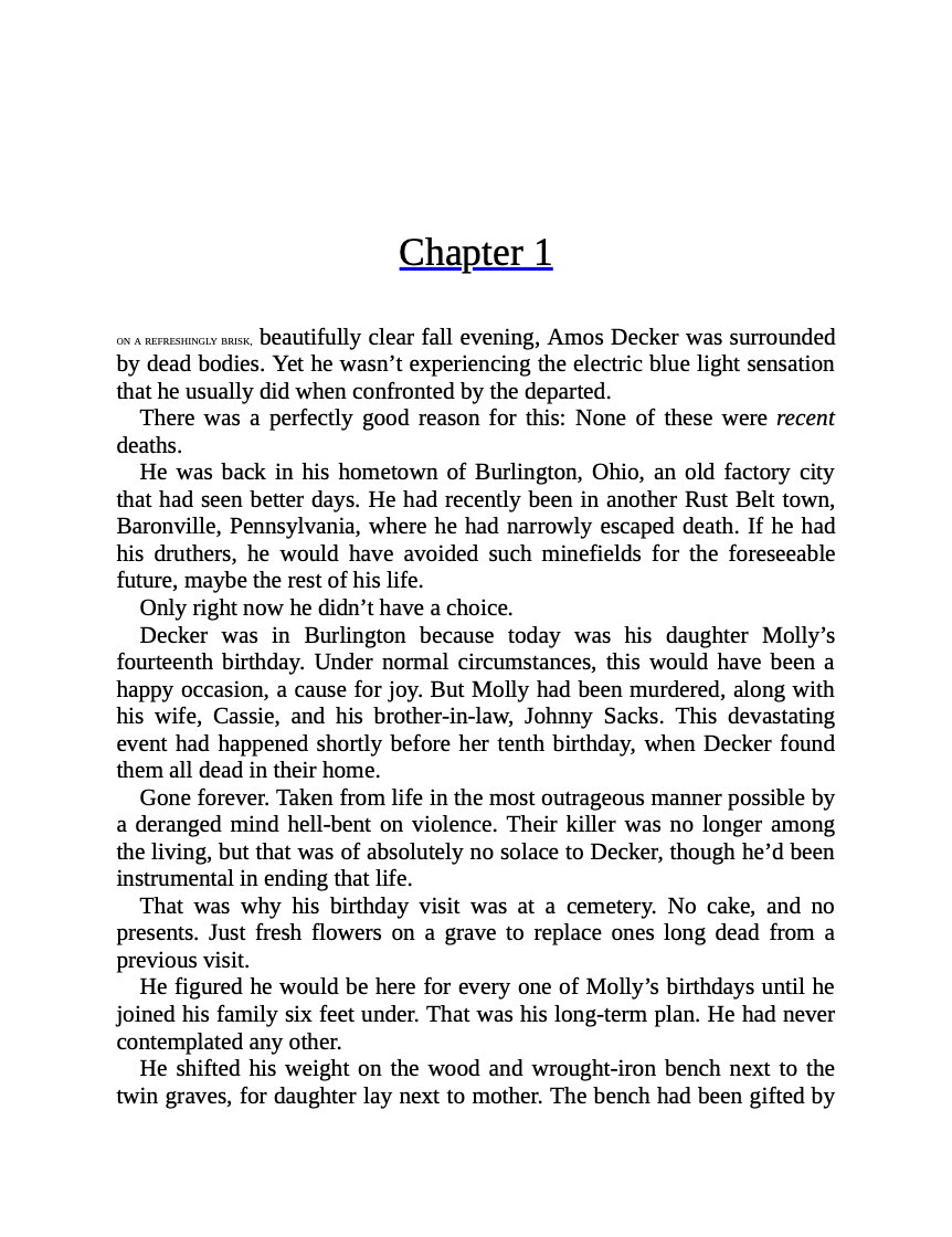 Amos Decker and his FBI partner Alex Jamison are visiting his hometown of Burlington, Ohio, when he's approached by an unfamiliar man. But he instantly recognizes the man's name: Meryl Hawkins. He's the first person Decker ever arrested for murder back when he was a young detective. Though a dozen years in prison have left Hawkins unrecognizably aged and terminally ill, one thing hasn't changed: He maintains he never committed the murders. Could it be possible that Decker made a mistake all those years ago? As he starts digging into the old case, Decker finds a startling connection to a new crime that he may be able to prevent, if only he can put the pieces together quickly enough...