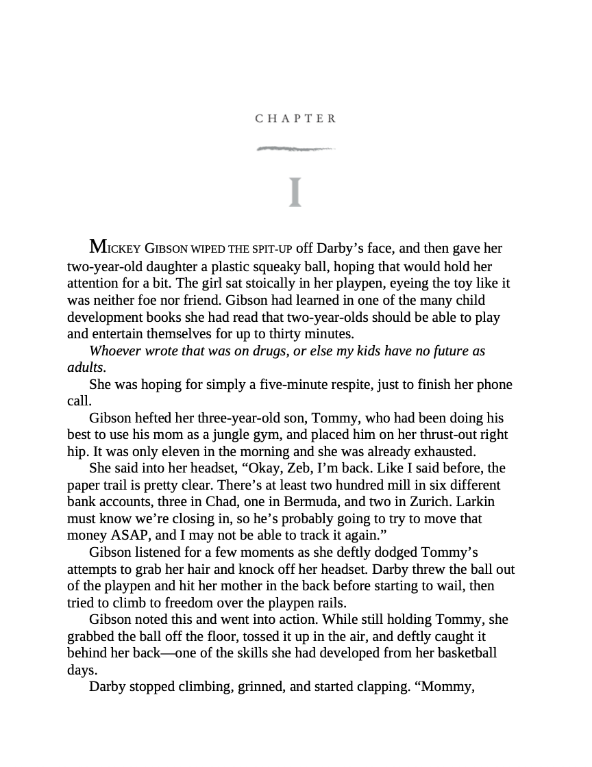 Mickey Gibson, single mother and former detective, leads a hectic life similar to that of many moms: juggling the demands of her two small children with the tasks of her job working remotely for ProEye, a global investigation company that hunts down wealthy tax and credit cheats.