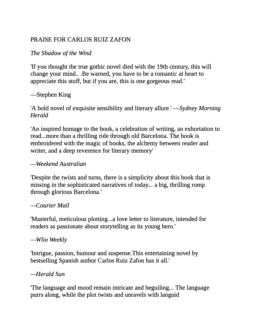 In an abandoned mansion at the heart of Barcelona, a young man, David Martin, makes his living by writing sensationalist novels under a pseudonym. Close to despair, he receives a letter from a reclusive French editor, Andreas Corelli, who makes him the offer of a lifetime--write a book unlike anything that has ever existed--a book with the power to change hearts and minds. In return, he will receive a fortune, and perhaps more. But as David begins the work, he realizes that there is a connection between his haunting book and the shadows that surround his home.
