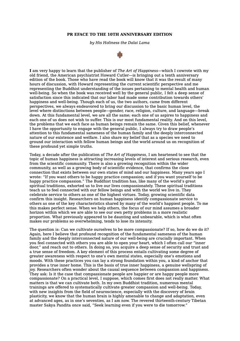 The Art of Happiness is a highly accessible guide for a western audience, combining the Dalai Lama's eastern spiritual tradition with Dr Howard C. Cutler's western perspective. Covering all key areas of human experience, they apply the principles of Tibetan Buddhism to everyday problems and reveal how one can find balance and complete spiritual and mental freedom. For the many who wish to understand more about the Dalai Lama's approach to living, there has never been a book which brings his beliefs so vividly into the real world.