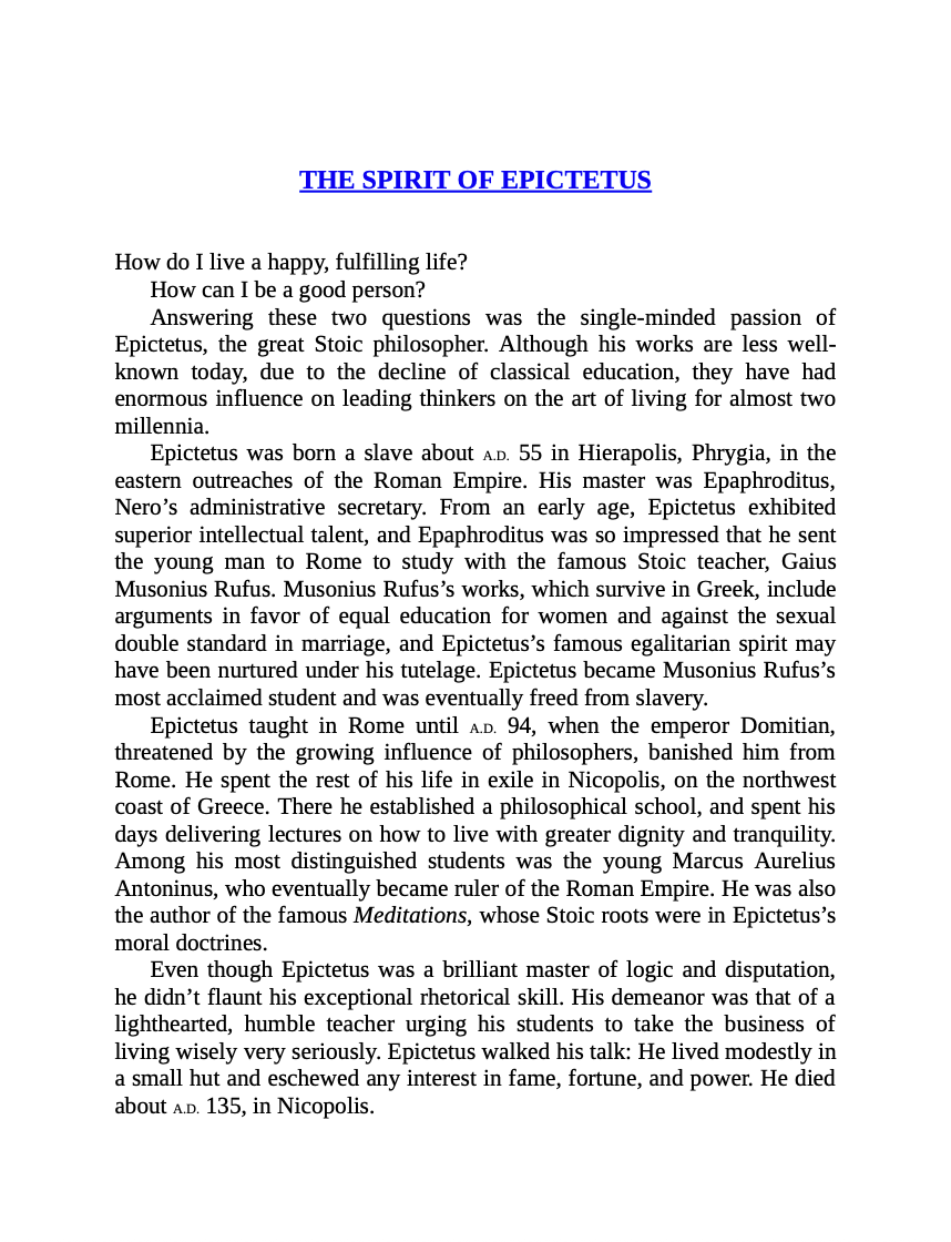Epictetus was born into slavery about A.D. 55 in the eastern outreaches of the Roman Empire. Sold as a child and crippled from the beatings of his master, Epictetus was eventually freed, rising from his humble roots to establish an influential school of Stoic philosophy. Stressing that human beings cannot control life, only how they respond to it, Epictetus dedicated his life to outlining the simple way to happiness, fulfillment, and tranquility. By putting into practice the ninety-three witty, wise, and razor-sharp instructions that make up The Art of Living, readers learn to successfully meet the challenges of everyday life and face life's inevitable losses and disappointments with grace. Epictetus's teachings rank among the greatest wisdom texts of human civilization. Sharon Lebell presents this esteemed philosopher's invaluable insights for the first time in a splendidly down-to-earth rendition. The result is the West's first and best primer for living the best possible life -- as helpful in the twenty-first century as it was in the first.