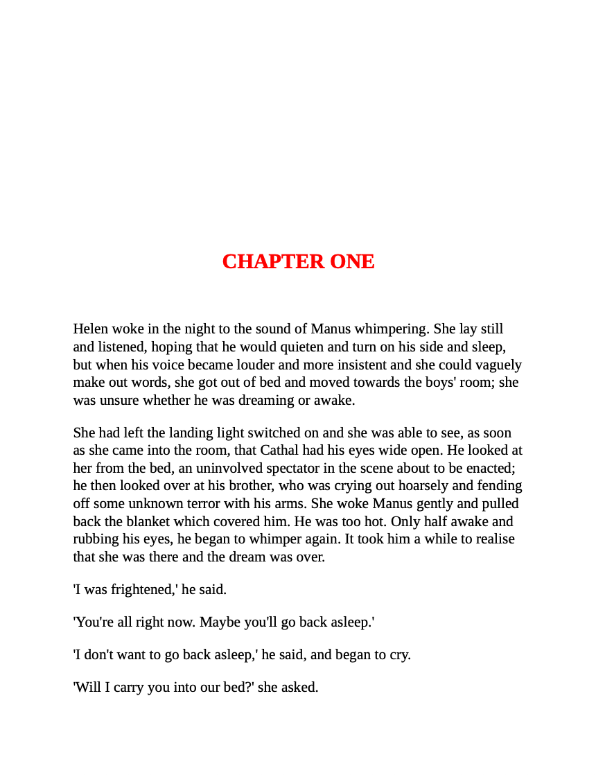 It is Ireland in the early 1990s. Helen, her mother, Lily, and her grandmother, Dora, have come together to tend to Helen's brother, Declan, who is dying of AIDS. With Declan's two friends, the six of them are forced to plumb the shoals of their own histories and to come to terms with each other.