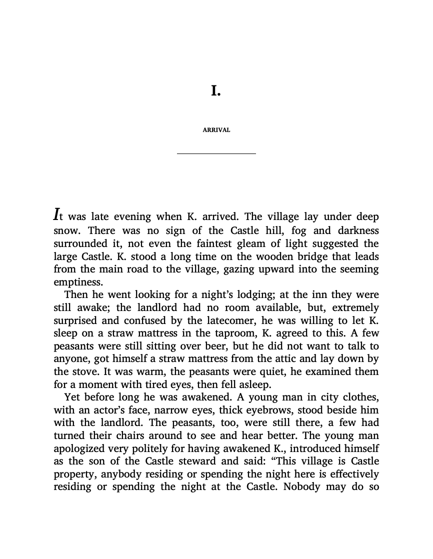 Arriving in a village to take up the position of land surveyor for the mysterious lord of a castle, the character known as K. finds himself in a bitter and baffling struggle to contact his new employer and go about his duties.