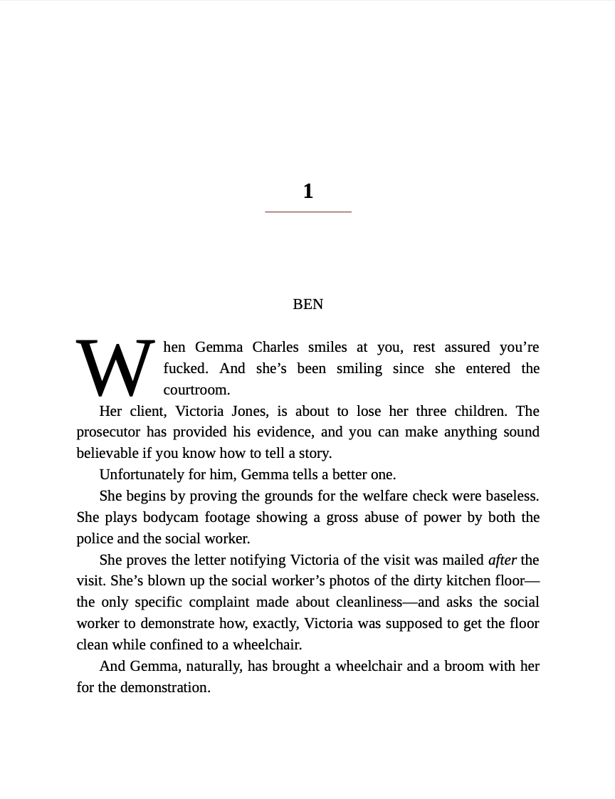 It’s been my policy to avoid him, but when a case comes into the firm—one that could change his career and mine—I make an exception. It means weekends and evenings by his side. It means enduring his smirk and his smart mouth and never taking the bait.