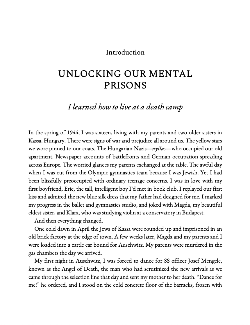 Eger explains that the worst prison she experienced is not the prison that Nazis put her in but the one she created for herself: the prison within her own mind. She describes the most pervasive imprisoning beliefs she has known—including fear, grief, anger, secrets, stress, guilt, shame, and avoidance—and the tools she has discovered to deal with these universal challenges. These lessons are offered through riveting and inspiring stories from her life and the lives of her patients.