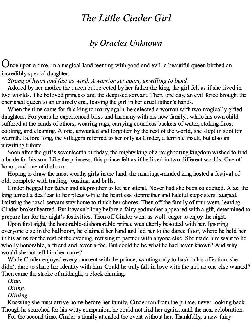 Princess Ashleigh Charmaine is known as the Glass Princess, fragile enough to shatter with a whisper of wind. Born with a weak heart, she dreams of being treated like anyone else. Unlike her headstrong sisters, she received no magical ability at birth and lives every day expecting to die. Until an oracle announces that Ashleigh is fated to play the part of Cinderella, wed a handsome royal and save the Kingdom of Sevon from the evil king and queen who once ruled the land.
