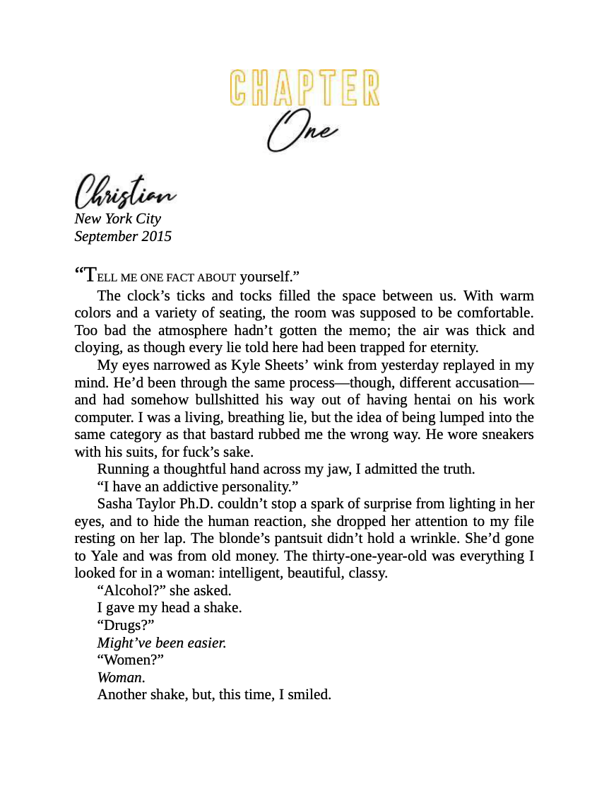She fears the dark.He rules it.Her dresses are too tight, her heels too tall. She laughs too loudly, eats without decorum, and mixes up most sayings in the book. Little do most know it's just a sparkly disguise, there to hide one panic attack at a time.Nobody can crack Gianna's facade . . . no one anyway, until he comes along.Most see a paragon of morality; a special agent upholding the law. In the New York underworld, others know him as a hustler, a killer, his nature as cold as the heart of ice in his chest. Christian Allister has always followed the life plan he'd envisioned in his youth, beneath the harsh lights of a frigid, damp cell. With a proclivity for order and the number three, he's never been tempted to veer off course. But perhaps one should never say never . . .One winter night and their lives intertwine. She hates him--his stone-cold demeanor, his arrogance and too-perceptive eye--but over the years, even as their games consist of insulting each other's looks and intelligence, she begins to live to play with him.Nowhere in Christian's plans had he ever prepared for Gianna. She's chaos embodied, not his type, and married, but none of that can stop his eyes from following her wherever she goes.All along, she doesn't even know that she's his--his frustration, his fascination.His maddest obsession.*Can be read as a standalone.