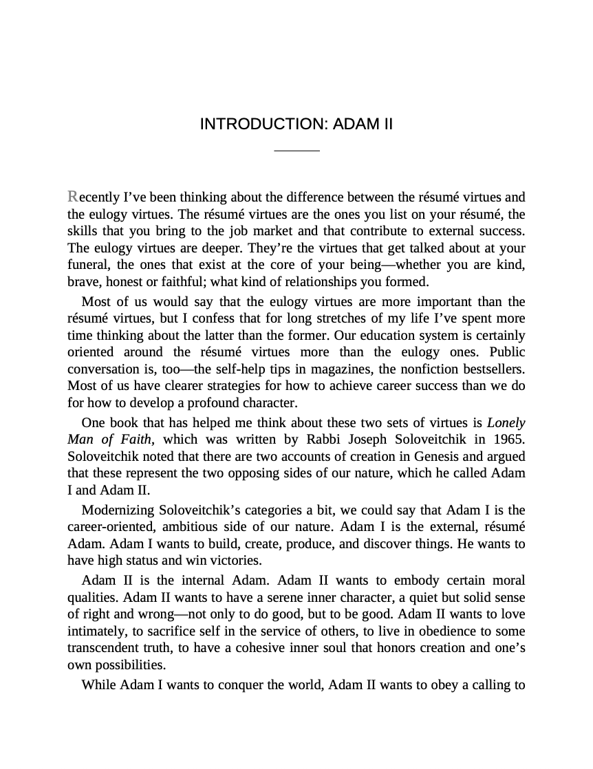 David Brooks argues that our hunger for wealth and status is eroding our ability to create meaningful inner lives. To show us how to live better, he looks at people whose sense of humility was fundamental to their success. What they all understood was a simple but counterintuitive truth- in order to fulfil yourself, you must learn how to forget yourself.