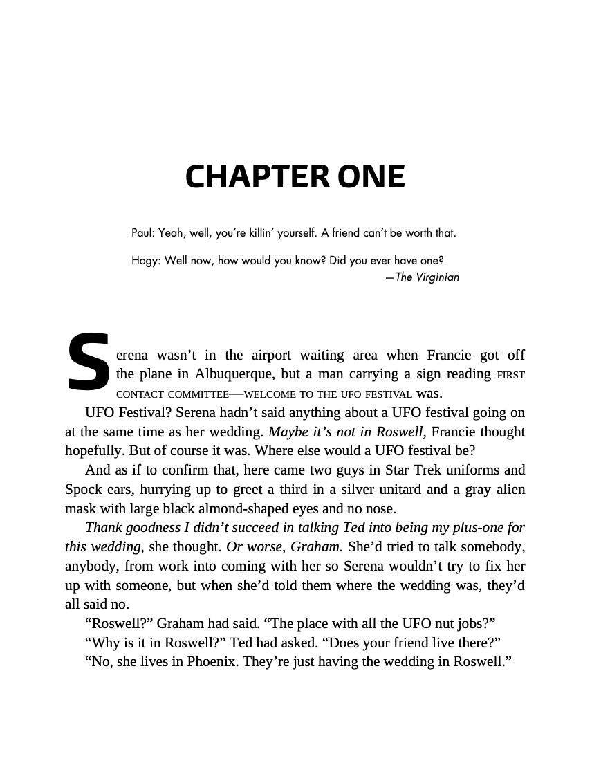 When level-headed Francie arrives in Roswell, New Mexico, for her college roommate’s UFO-themed wedding—complete with a true-believer bridegroom—she can’t help but roll her eyes at all the wide-eyed talk of aliens, which obviously don’t exist. Imagine her surprise, then, when she is abducted by one.