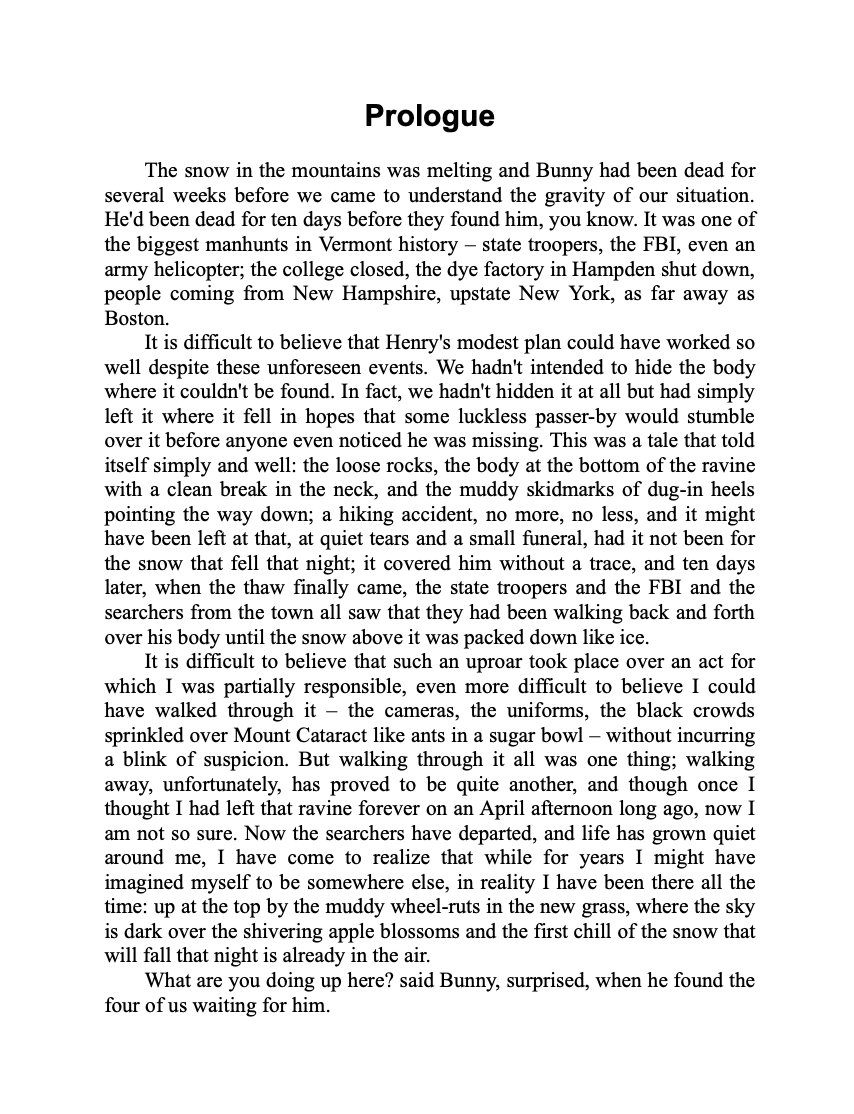 Under the influence of their charismatic classics professor, a group of clever, eccentric misfits at an elite New England college discover a way of thinking and living that is a world away from the humdrum existence of their contemporaries. But when they go beyond the boundaries of normal morality their lives are changed profoundly and for ever.