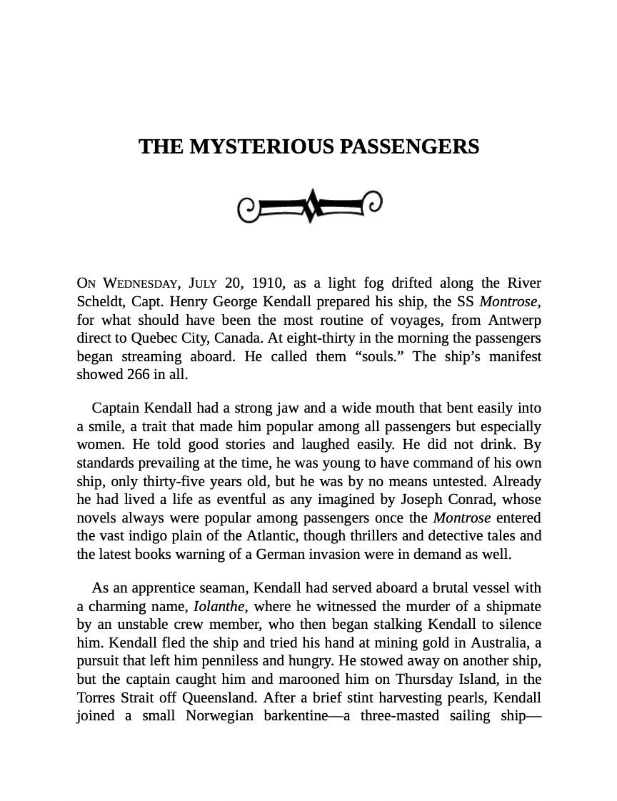 With his unparalleled narrative skills, Erik Larson guides us through a relentlessly suspenseful chase over the waters of the North Atlantic. Along the way, he tells of a sad and tragic love affair that was described on the front pages of newspapers around the world, a chief inspector who found himself strangely sympathetic to the killer and his lover, and a driven and compelling inventor who transformed the way we communicate.