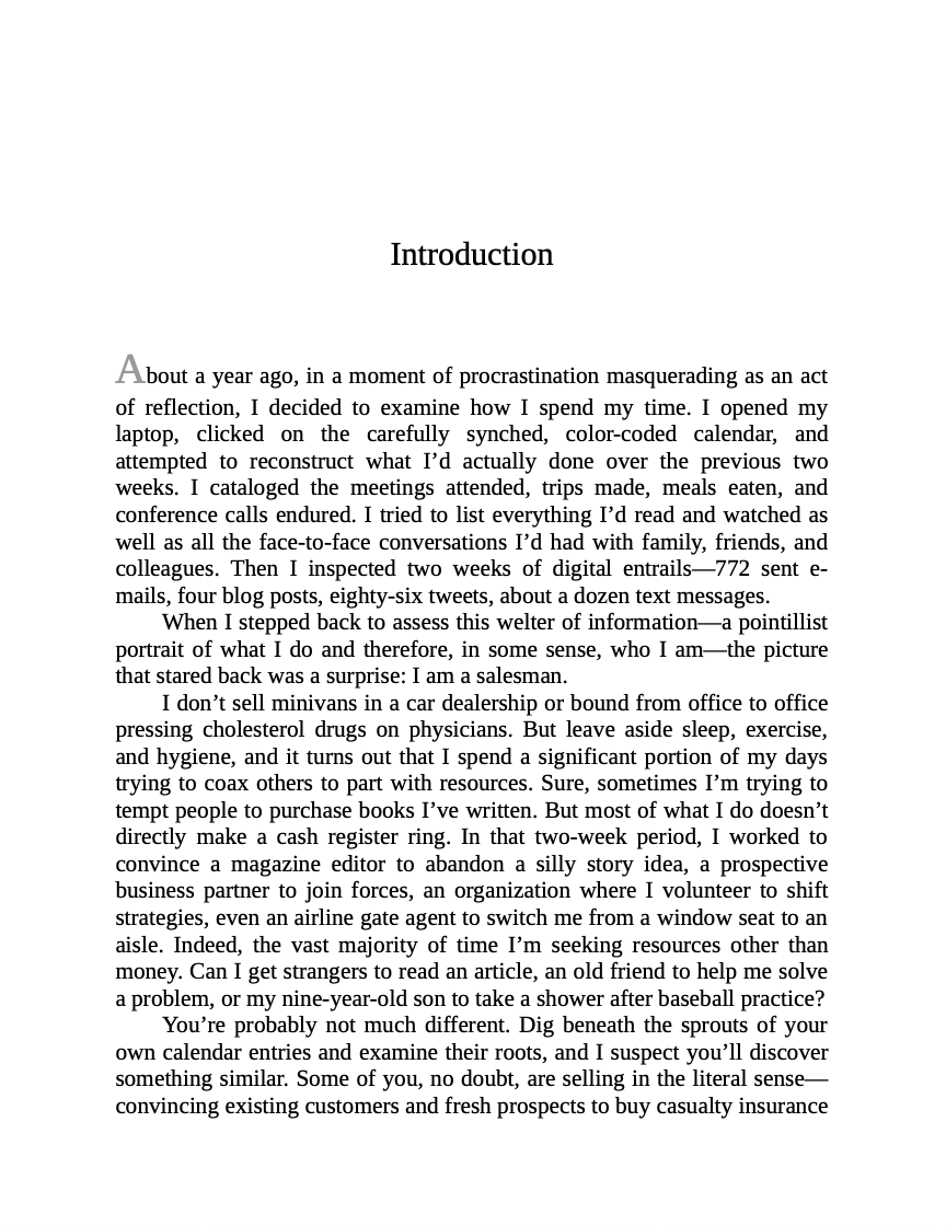 To Sell Is Human offers a fresh look at the art and science of selling. As he did in Drive and A Whole New Mind, Daniel H. Pink draws on a rich trove of social science for his counterintuitive insights. He reveals the new ABCs of moving others (it's no longer "Always Be Closing"), explains why extraverts don't make the best salespeople, and shows how giving people an "off-ramp" for their actions can matter more than actually changing their minds.