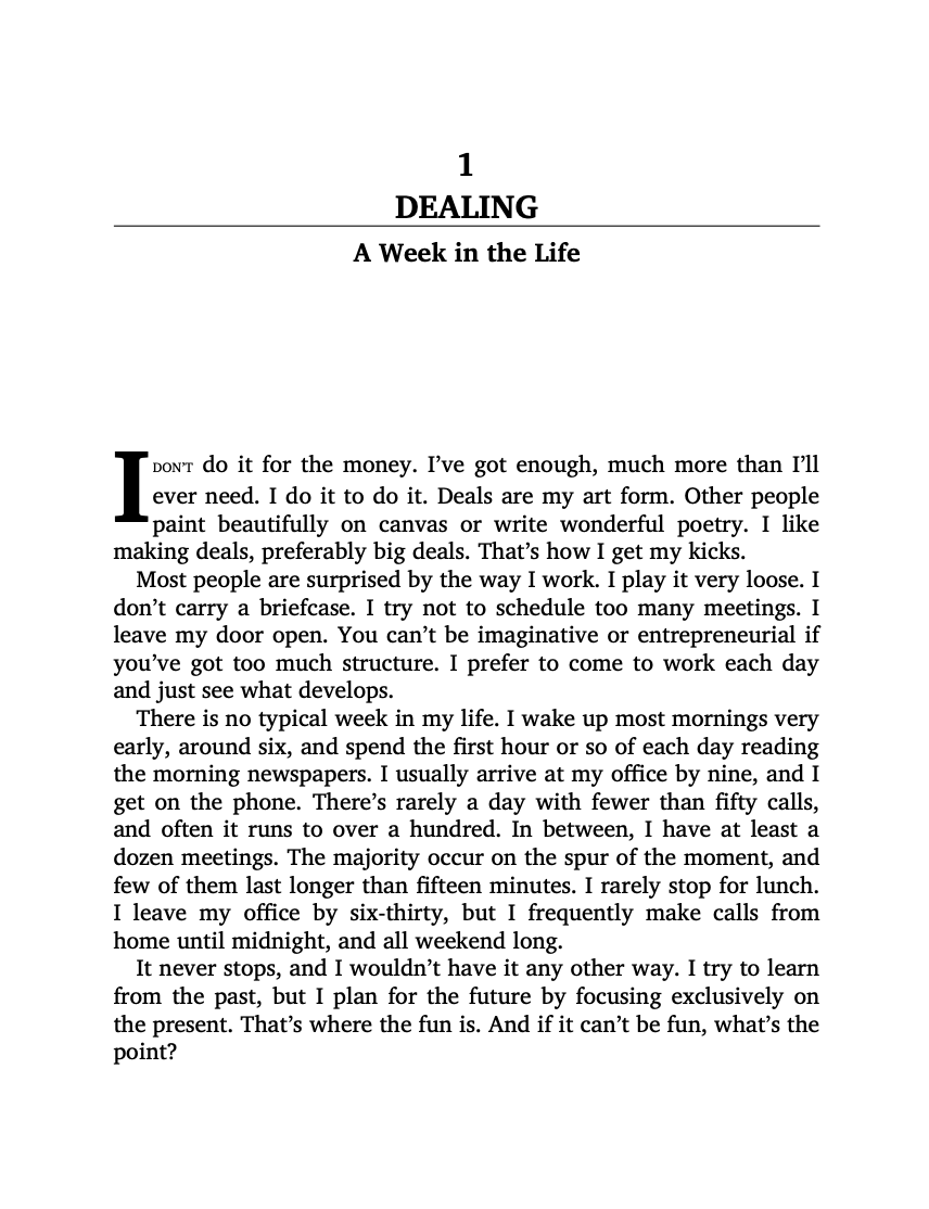 Here is Trump in action - how he runs his business and how he runs his life - as he meets the people he needs to meet, chats with family and friends, clashes with enemies, and changes the face of the New York City skyline. But even a maverick plays by the rules, and Trump has formulated eleven guidelines for success. He isolates the common elements in his greatest deals; he shatters myths; he names names, spells out the zeros, and fully reveals the deal-maker's art. And throughout, Trump talks - really talks - about how he does it. Trump: The Art of the Deal is an unguarded look at the mind of a brilliant entrepreneur and an unprecedented education in the practice of deal-making. It's the most streetwise business book there is - and the ultimate read for anyone interested in making money and achieving success, and knowing the man behind the spotlight.